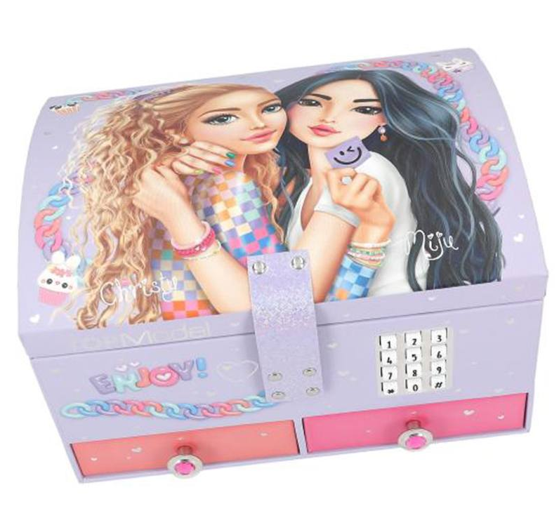 Joyero Enjoy con código personalizable de 4 dígitos. Al abrirse sonará una canción durante 20 seg aprox. Consta con una bandeja extraíble subdividida en tres compartimentos, además de dos cajones. Dimensiones 15.7x20x12.5cm.
