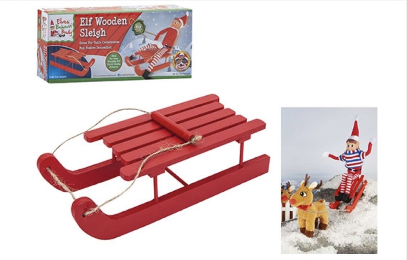 Trineo de madera hecho para los elfos de la navidad. Es de color rojo, presentado en caja y cuenta con una cuerdita para que el elfo pueda «agarrarse».